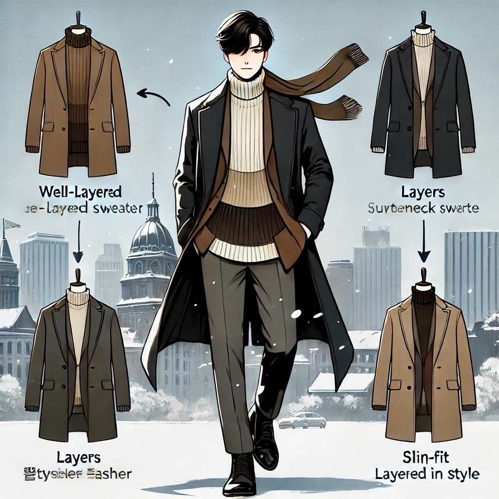남성들은 레이어드 패션을 통해 더욱 세련되고 남성적인 스타일을 연출할 수 있습니다. 기본적으로 터틀넥 스웨터 위에 셔츠를 겹쳐 입고, 그 위에 더블 브레스트 코트를 착용하면 클래식한 겨울 룩을 완성할 수 있습니다. 여기에 슬림핏 팬츠와 부츠를 매치하면 더욱 남성적인 매력을 강조할 수 있습니다. 이런 스타일은 깔끔하면서도 세련된 인상을 주기에 좋은 선택입니다.